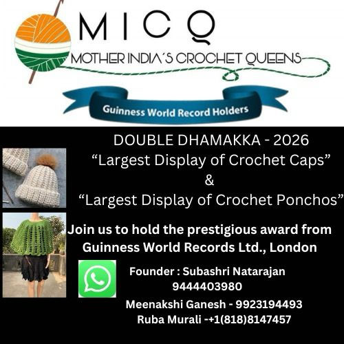 Welcome to Mother India Crochet Queen (MICQ), a vibrant community of crochet enthusiasts from all corners of the globe. We are a proud group of talented artisans, primarily women, who have come together to revive and celebrate the timeless art of crochet. Our passion for this craft has led us to achieve extraordinary milestones, including four Guinness World Records. At MICQ, we don’t just create; we connect, inspire, and empower women worldwide to weave their dreams into reality—one stitch at a time.